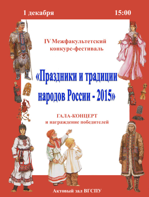1 декабря в 15.00 в актовом зале ВГСПУ состоится гала-концерт и награждение лауреатов ежегодного межфакультетского конкурса-фестиваля «Праздники и традиции народов России».